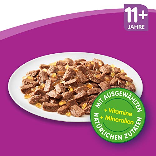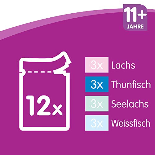 Details: Whiskas 11+ Katzenfutter – Fisch Auswahl in Gelee – Leicht verdauliches Nassfutter in 48 Portionsbeuteln für Katzen ab 11 Jahren und älter – 4er Pack (4 x 12 Portionsbeutel à 100g)