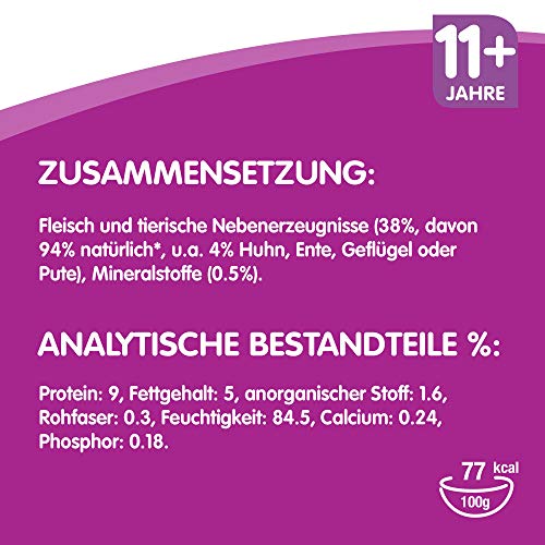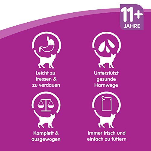 Um ältere Katzen ab 11 Jahren zufrieden und gesund zu halten, verwöhnt das Feuchtfutter die Geschmackssinne durch die Kombination aus zarten Stückchen und saftigem Gelee